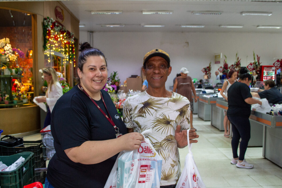 Legendas: Claudia Nonemacher, do Dália Supermercado, entregou o kit para