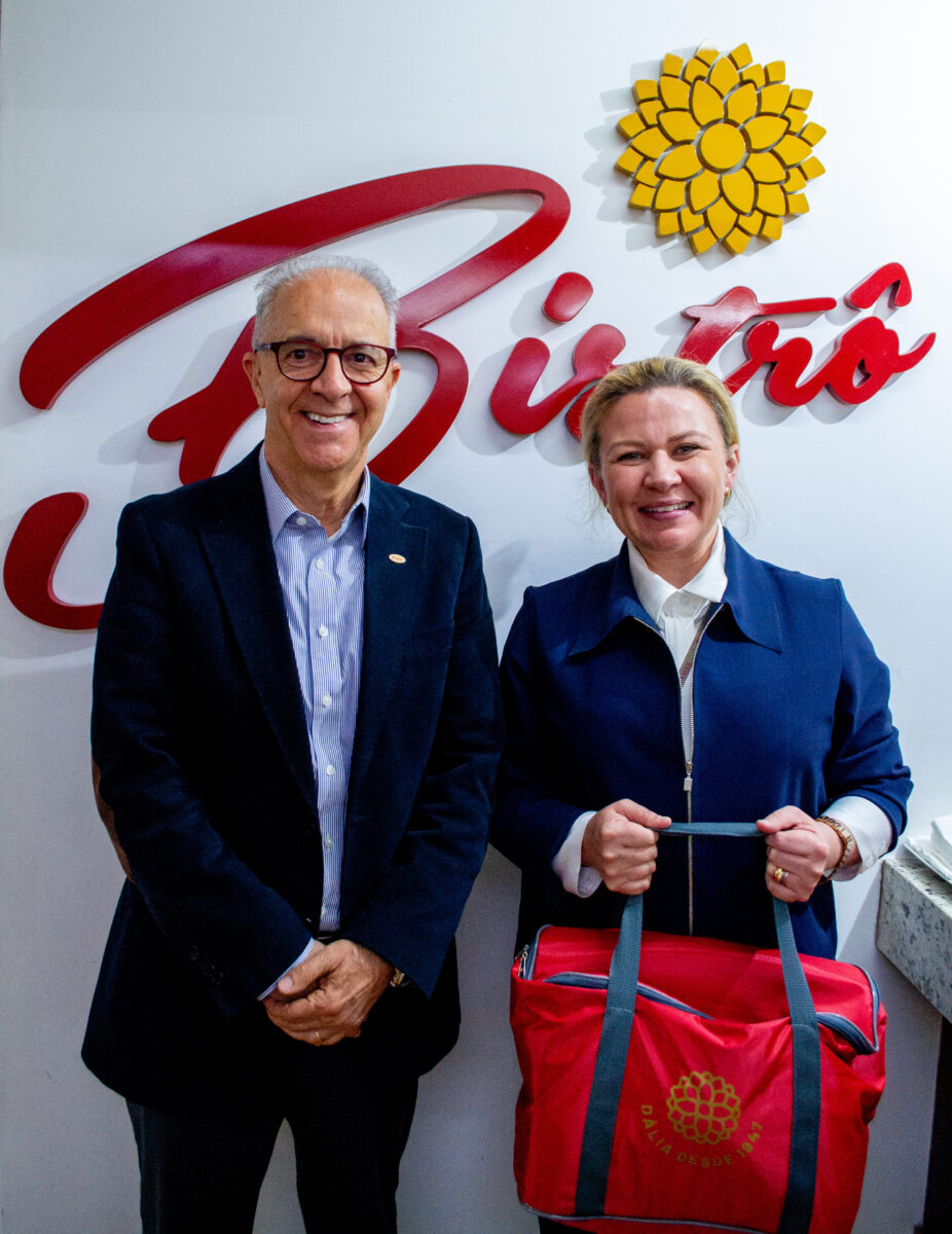 Durante o encontro, Freitas presenteou a visitante com uma bolsa térmica recheada de produtos da Dália e aproveitou a oportunidade para contar a origem de alguns nomes de produtos da cooperativa. “A linguiça do Rosário foi criada especialmente para atender à demanda de um food truck em Porto Alegre que, carrega o nome Rosário. Mas com o sucesso do produto, expandimos produção para o consumidor final. Já o British Bacon é outro produto especial, pois segue o mesmo padrão do consumido no Reino Unido, oferecendo mais carne de lombo e menos gordura”, explicou Freitas ao entregar a bolsa com outros produtos como queijo colonial, leite da linha Sabor da Fazenda e cortes frango temperado.