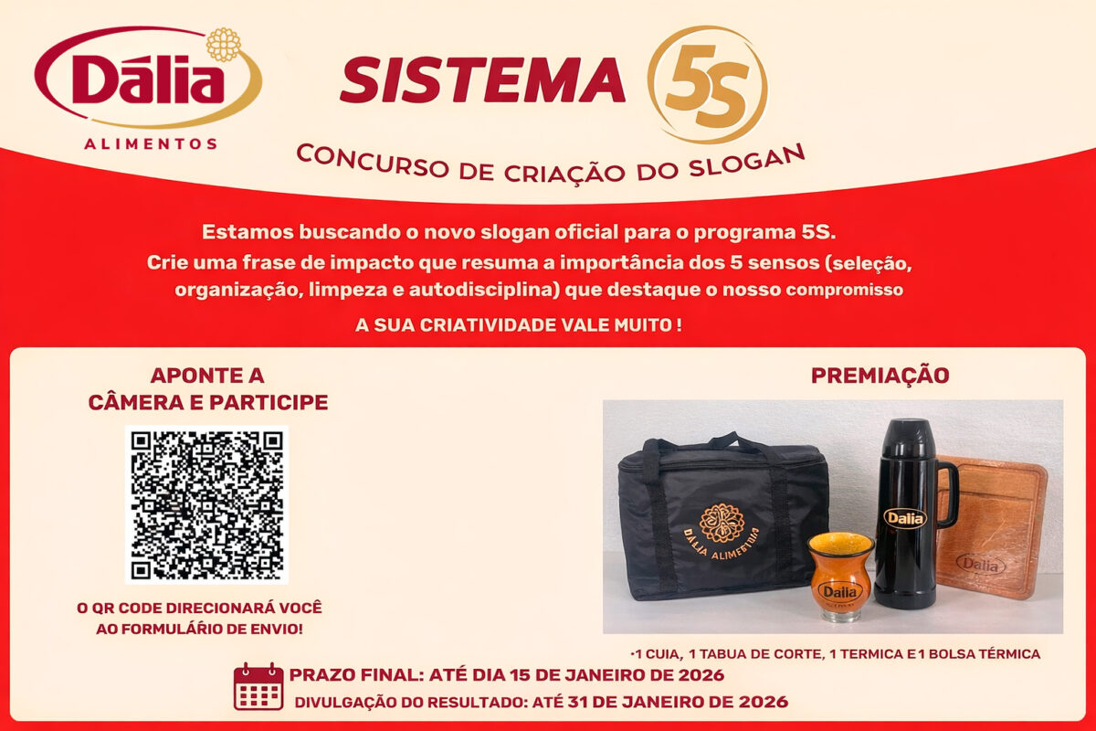 Desde o dia 16 de dezembro de 2025, a Divisão de Controle de Qualidade da Cooperativa Dália Alimentos promove, de forma inédita, um concurso para a criação de um slogan para o Programa 5S da cooperativa. A melhor frase será premiada com um kit especial da Dália Alimentos, composto por cuia, tábua de corte, garrafa e bolsa térmica.