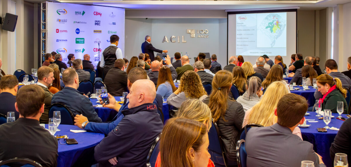 Por fim, o Presidente da ACIL, Joni Zagonel, em sua saudação, destacou a importância de trazer para o evento o case da Cooperativa Dália Alimentos. Ele destacou que 40% do PIB gaúcho é proveniente da agropecuária. “O agronegócio e a indústria alimentícia estão profundamente conectados em nossa região. A Dália, que representa mais de duas mil famílias associadas, é uma gigante do setor agropecuário e tem papel crucial no desenvolvimento regional. É essencial garantir a preservação e cuidado com a cooperativa para que ela continua prosperando no Vale do Taquari”, frisou. Ao final do evento, Zagonel conduziu as perguntas do público ao palestrante.